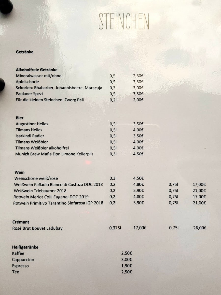 The menu at Steinchen boasts a delightful selection of both vegan and vegetarian offerings, alongside an array of snacks and beverages that cater to every palate. Customers rave about the classic weiße Würste, tender and flavorful, served with a generous portion of soft pretzels. Pair this with a homemade lemonade infused with elderflower, mint, and a touch of lemon for a refreshing sip on a warm day.